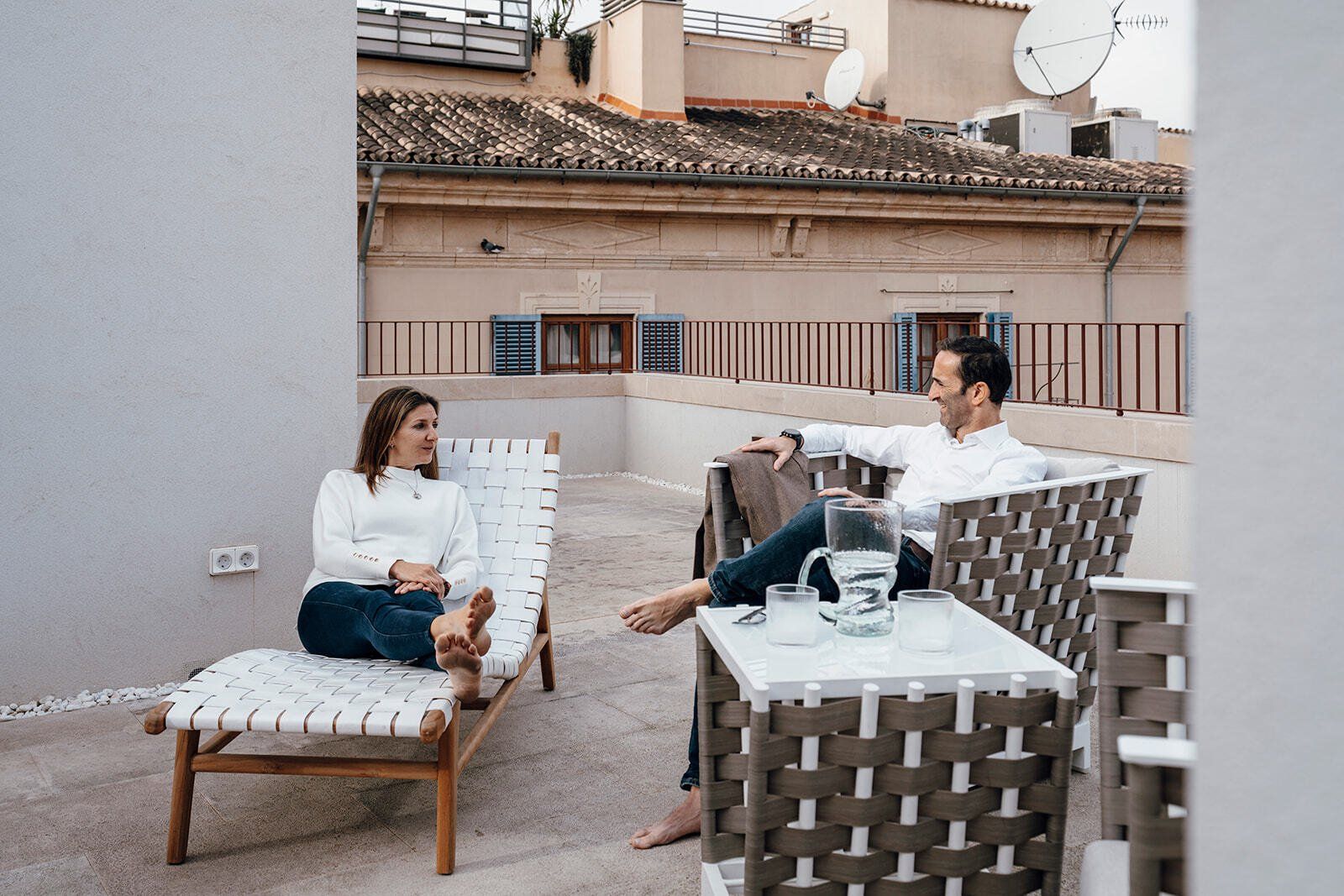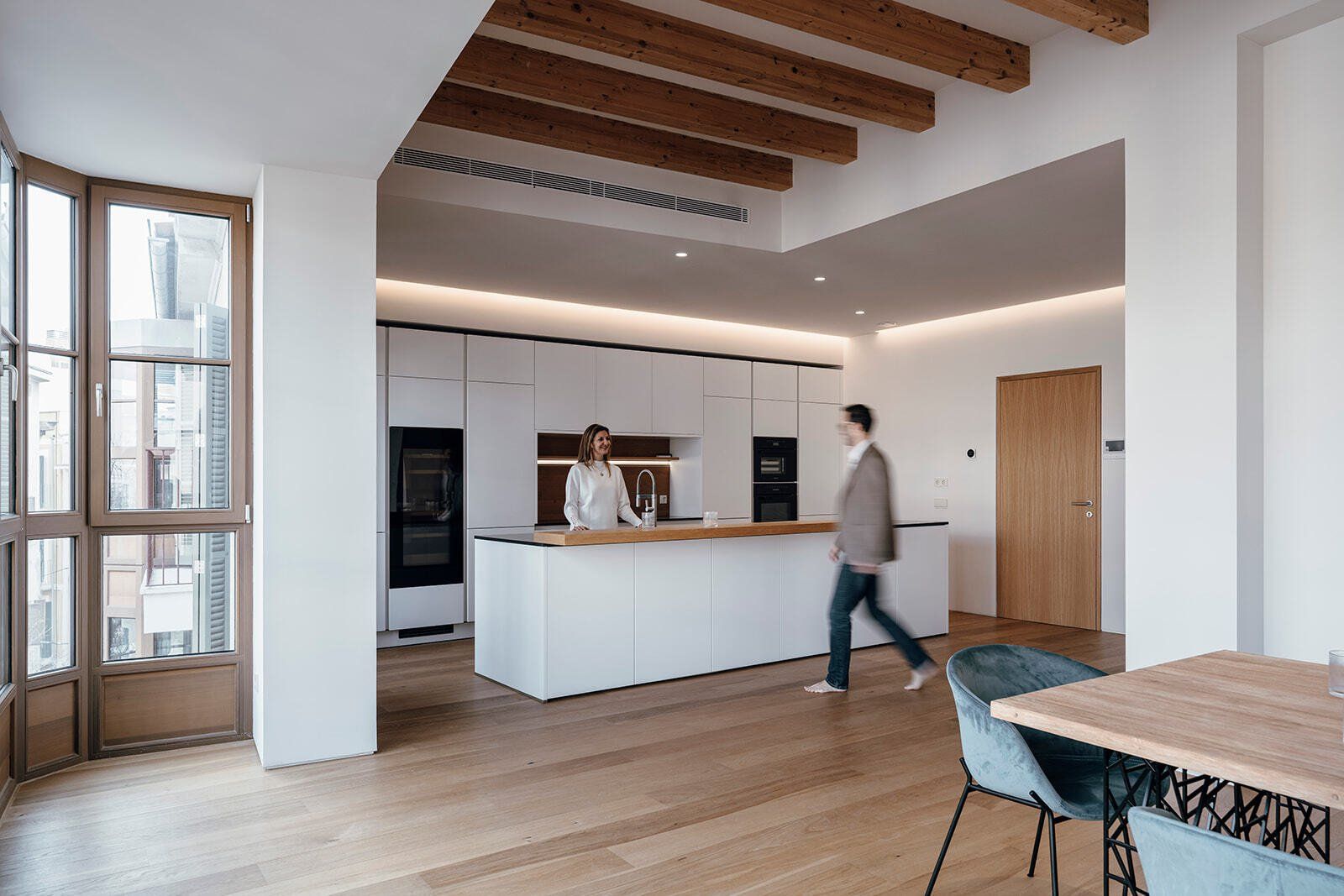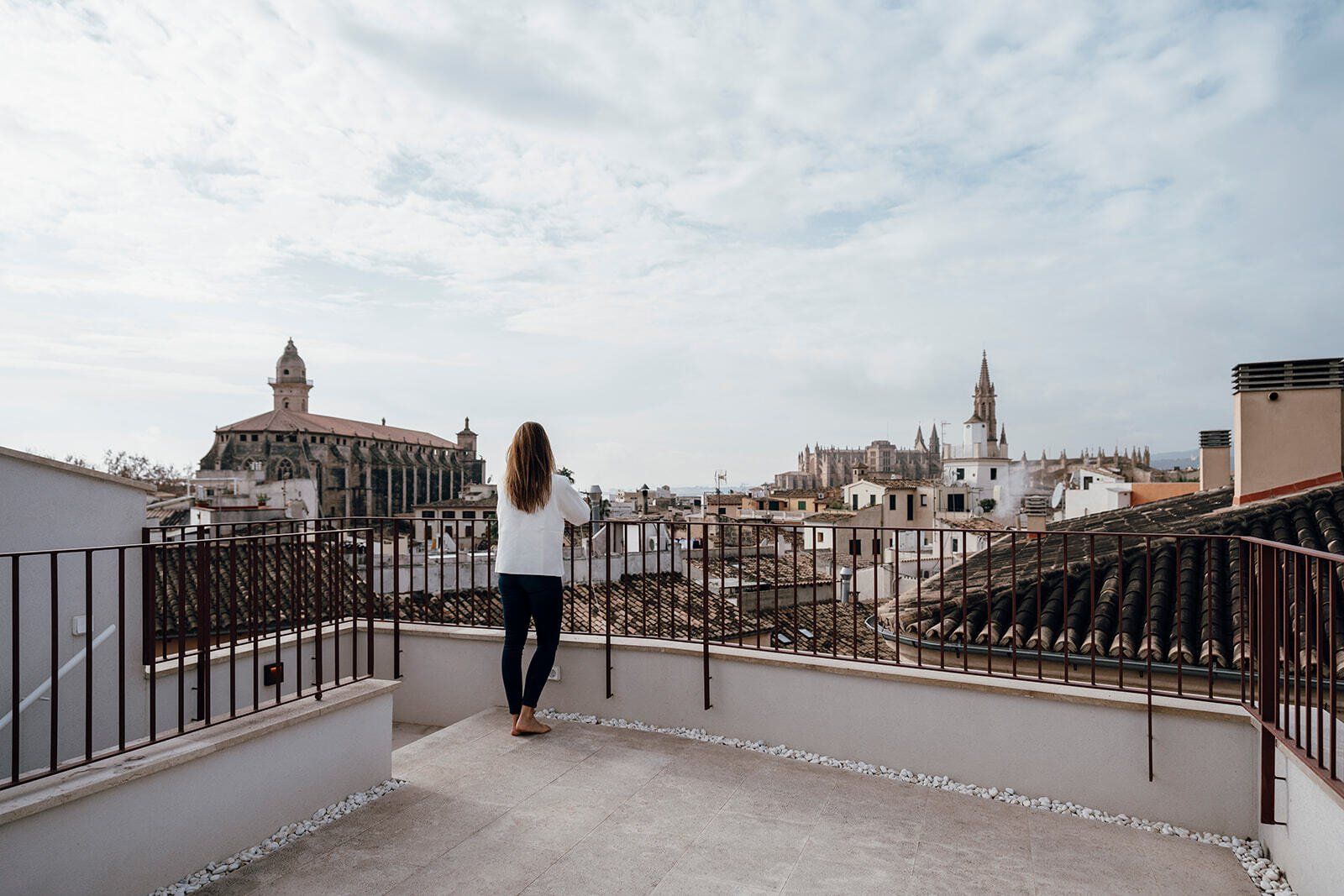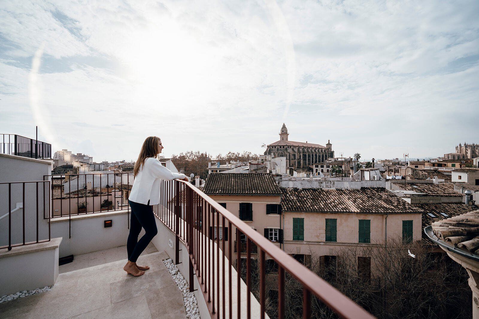 The most spacious duplex has 4 bedrooms and 334 square meters divided into several floors. You accede from the 3rd floor to the modern equipped kitchen and the big eating area with wooden ceiling beams, which is followed by a relaxing or chillout area. On the third floor you can find the bedrooms, bathrooms and dressing rooms. A special highlight represents the very bright master bedroom which seems to convert to a home cinema through the big wintergarden. On the 4th floor there is an additional living area and the access to the 2 rooftop terraces, the second one with views to the cathedral and the sea.