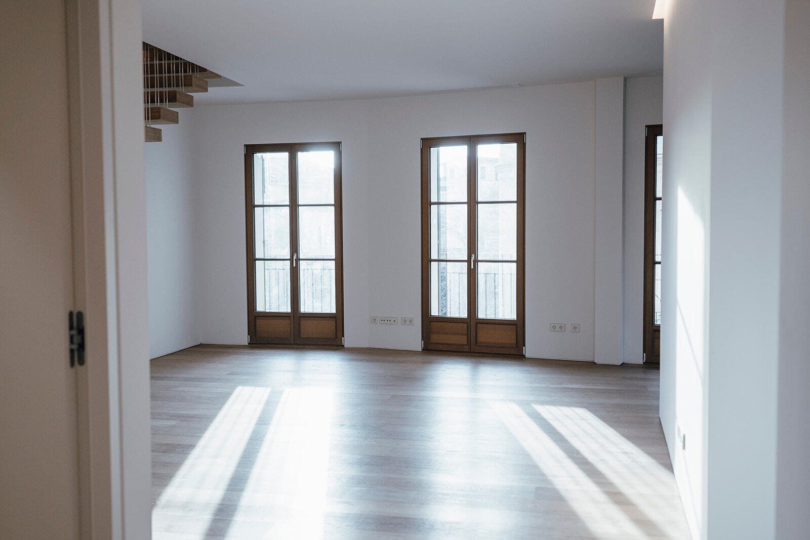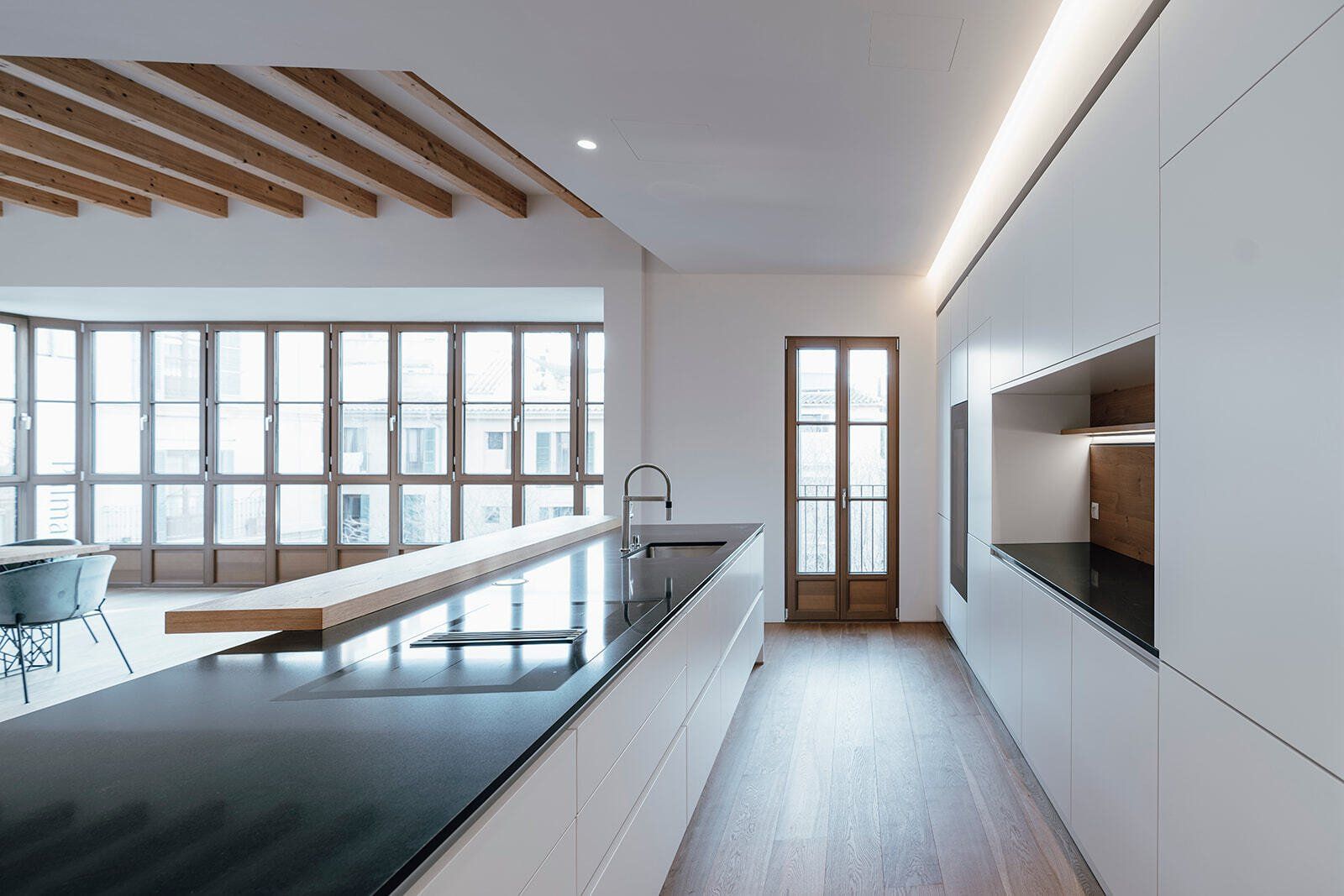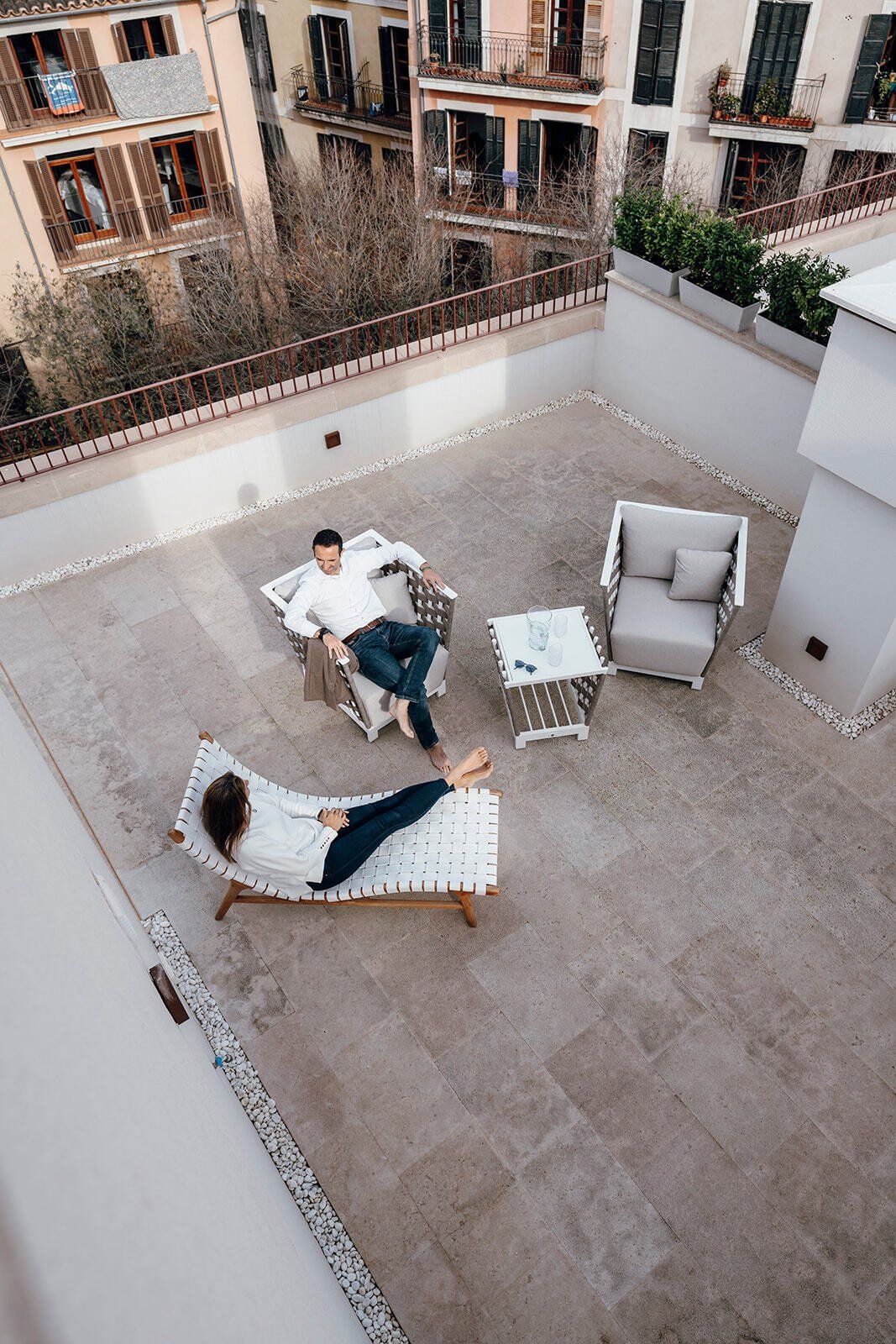The most spacious duplex has 4 bedrooms and 334 square meters divided into several floors. You accede from the 3rd floor to the modern equipped kitchen and the big eating area with wooden ceiling beams, which is followed by a relaxing or chillout area. On the third floor you can find the bedrooms, bathrooms and dressing rooms. A special highlight represents the very bright master bedroom which seems to convert to a home cinema through the big wintergarden. On the 4th floor there is an additional living area and the access to the 2 rooftop terraces, the second one with views to the cathedral and the sea.