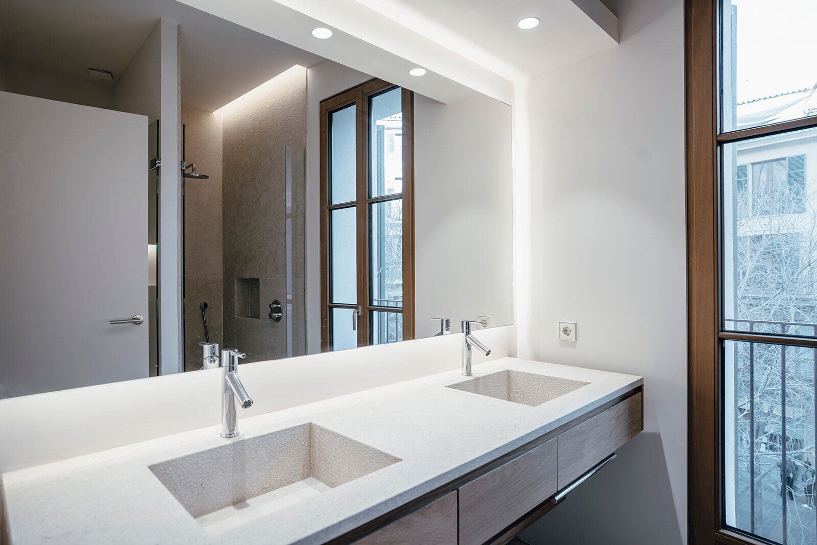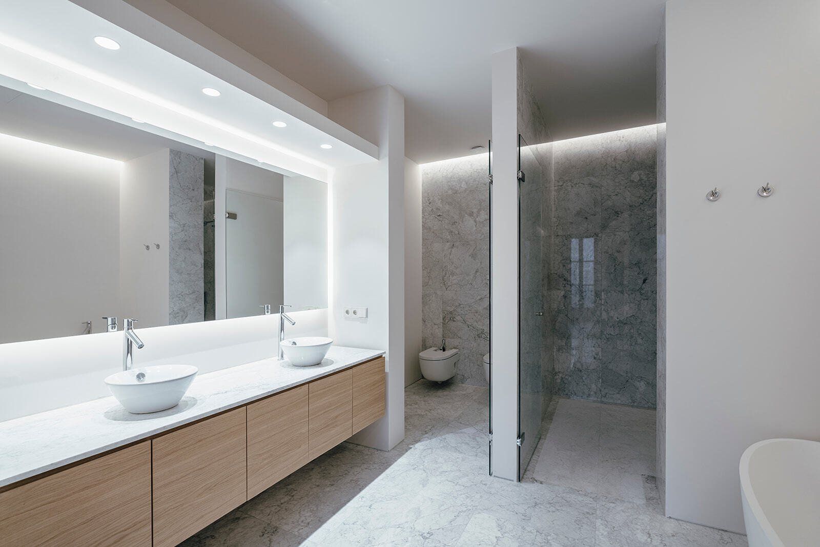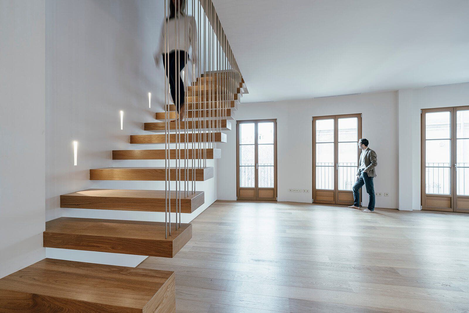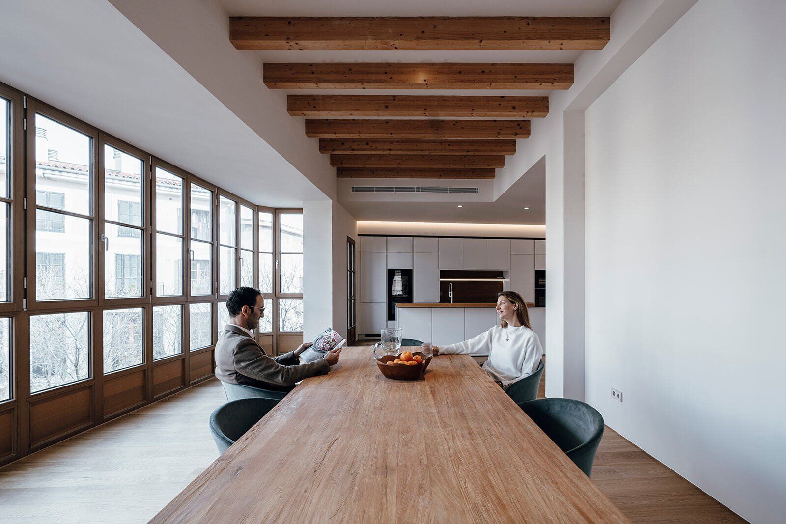 The most spacious duplex has 4 bedrooms and 334 square meters divided into several floors. You accede from the 3rd floor to the modern equipped kitchen and the big eating area with wooden ceiling beams, which is followed by a relaxing or chillout area. On the third floor you can find the bedrooms, bathrooms and dressing rooms. A special highlight represents the very bright master bedroom which seems to convert to a home cinema through the big wintergarden. On the 4th floor there is an additional living area and the access to the 2 rooftop terraces, the second one with views to the cathedral and the sea.